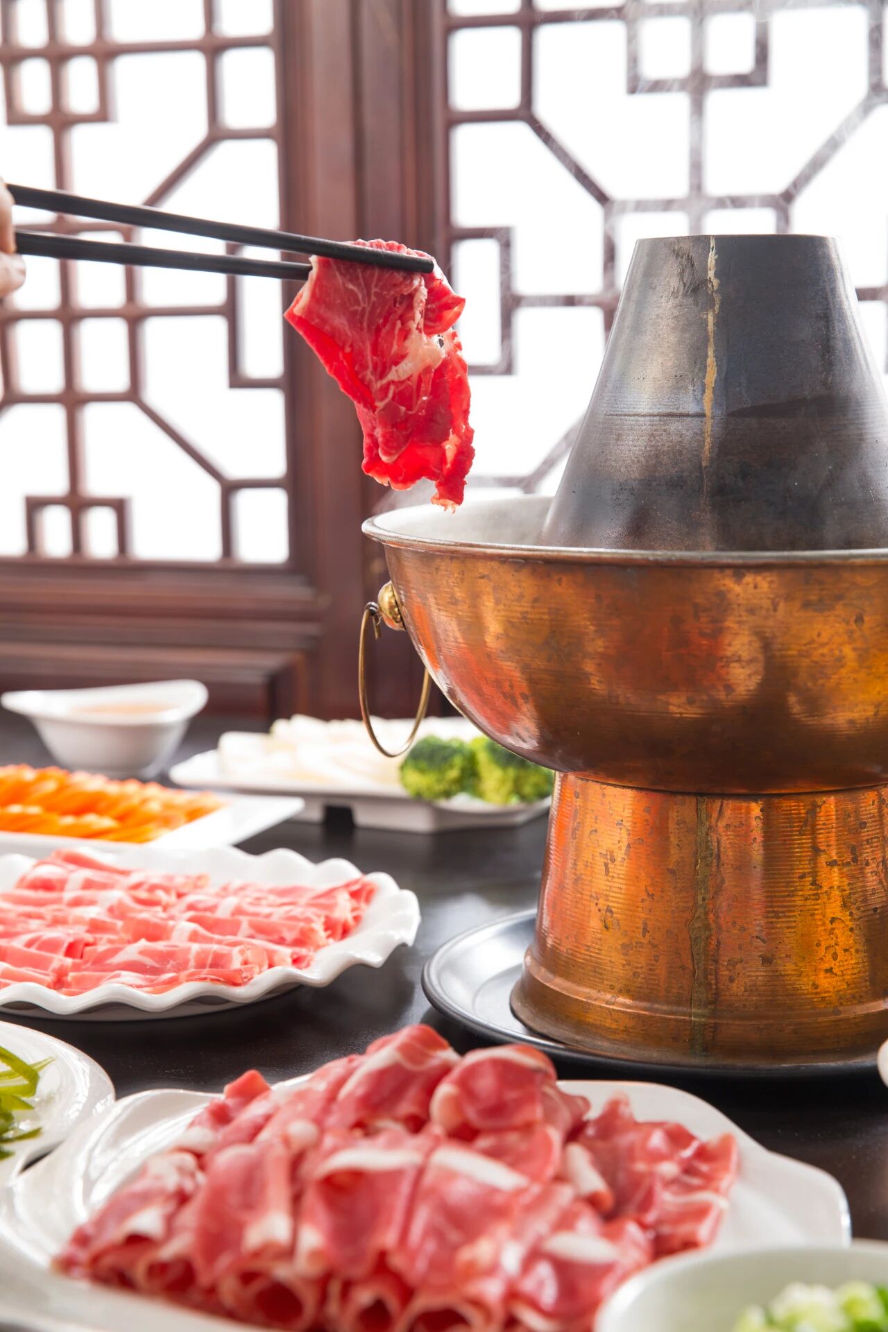涮羊肉的菜品不丰富,羊肉是当之无愧留的主角,白菜、豆腐、粉丝是最常见也最经典的配菜。
