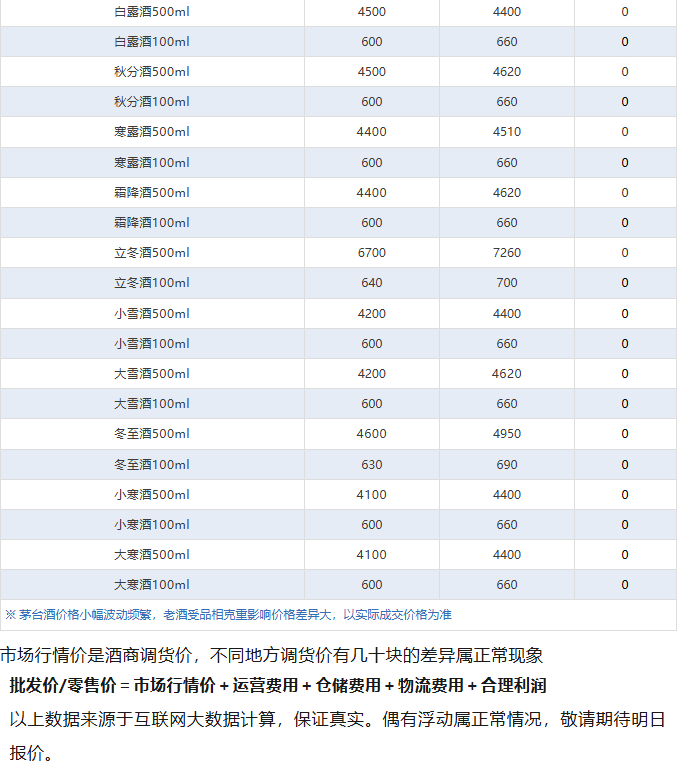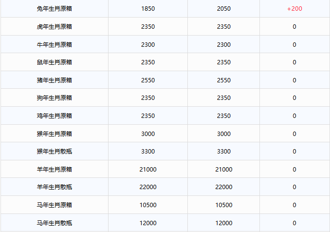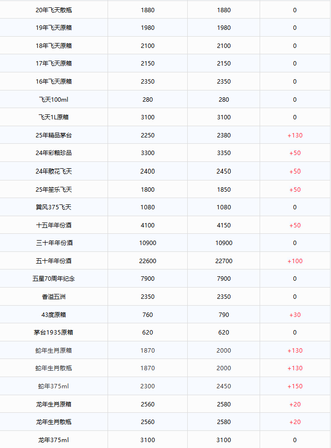 但价格涨幅最为夸张的还是蛇年茅台,作为茅台第一轮生肖酒的最后一款产品,蛇茅上市后受到市场的追捧,批发价一度突破5000元/瓶,随后价格一路回落,曾一度稳定在2499元/瓶左右,但下半年价格持续走低,最低一度跌至1750元/瓶左右。但今日批发价格从1770元上升至2000元/瓶。