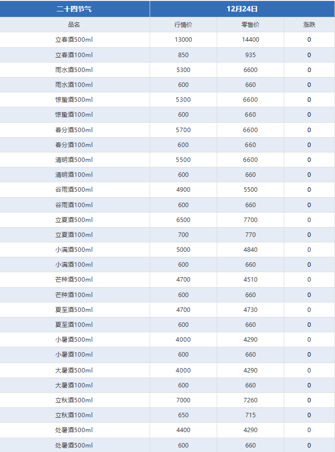 “红色壹号酒业”披露的最新批发参考价显示,12月24日,25年飞天茅台原箱报1620元/瓶,较上一日涨40元;25年飞天茅台散瓶报1590元/瓶,较上一日涨40元。24年飞天茅台原箱报1630元/瓶,较上一日涨30元;24年飞天茅台散瓶报1615元/瓶,较上一日涨35元。散花飞天和笙乐飞天也分别有100元/瓶和170元/瓶的涨幅,收复了近期部分跌幅。