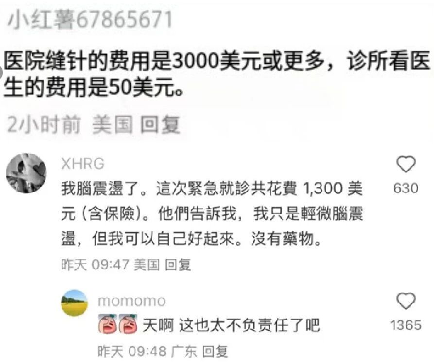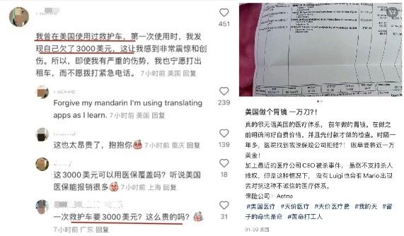 美国救护车平均使用价格在1000美元左右,中国救护车只需要200元左右,差价高达15倍;美国医院缝针费用少则300-500美元,多则2000-3000美元,中国只需要200-500元人民币,两者差几十倍;有美国网友晒出自己做个胃镜花10000美元,中国网友回复自己刚做完胃镜全套也没超过人民币2000元,特邀对方前来中国体验……