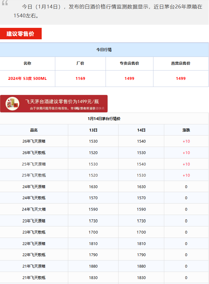 根据国酒财经、第一财经等媒体的报道,根据市场渠道反馈的消息,茅台将对茅台15年、43度贵州茅台酒以及茅台1935的2026年合同价统一做出调整,其中: